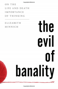 ماه فوریه است و با الیزابت مینیچ روی کاناپهی منزل دوستی در منطقهی آپر وست سایدِ نیویورک نشستهایم و او به من میگوید: «این میتواند تلنگری بزند و مردم را دوباره به فکر کردن وادارد. داشتم دیوانه میشدم از این که میدیدم مردم در رسانهها دائم از “پیشپاافتادگی شر” حرف میزنند، و این که حرفها خودش به امری پیشپاافتاده تبدیل شده برای من واقعاً غیر قابل تحمل شده بود.»