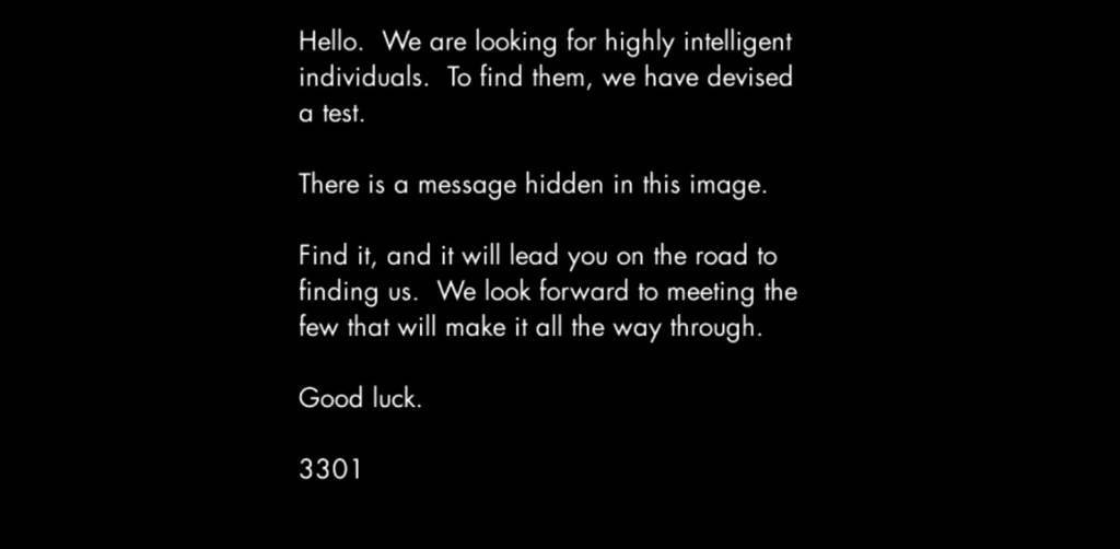 «سلام. ما بهدنبال افراد بسیار باهوش میگردیم. برای یافتن این افراد، ما آزمونی طرح کردهایم. پیامی در این تصویر پنهان است. آن را بیابید، و با پیگیریِ آن، ما را پیدا کنید. ما منتظر ملاقات عدۀ معدودی هستیم که این راه را با موفقیت طی کنند. موفق باشید.»