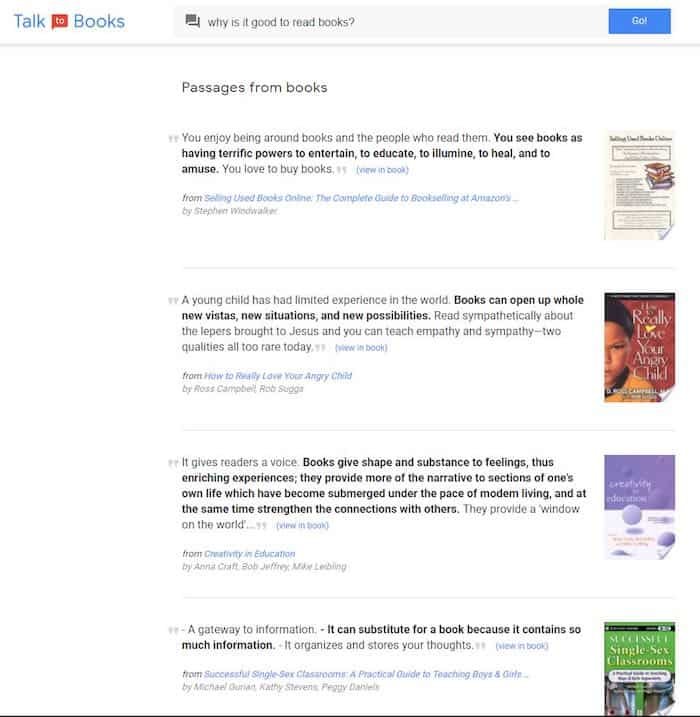 اما تاک تو بوکز (Talk to Books) ابزار جدید گوگل که چند روز پیش فعال شد، در ظرف کمتر از یک ثانیه میتواند پاسخ سوال شما را از میان صد هزار کتاب منتشر شده روی گوگل بوکز (Google Books) پیدا کند.